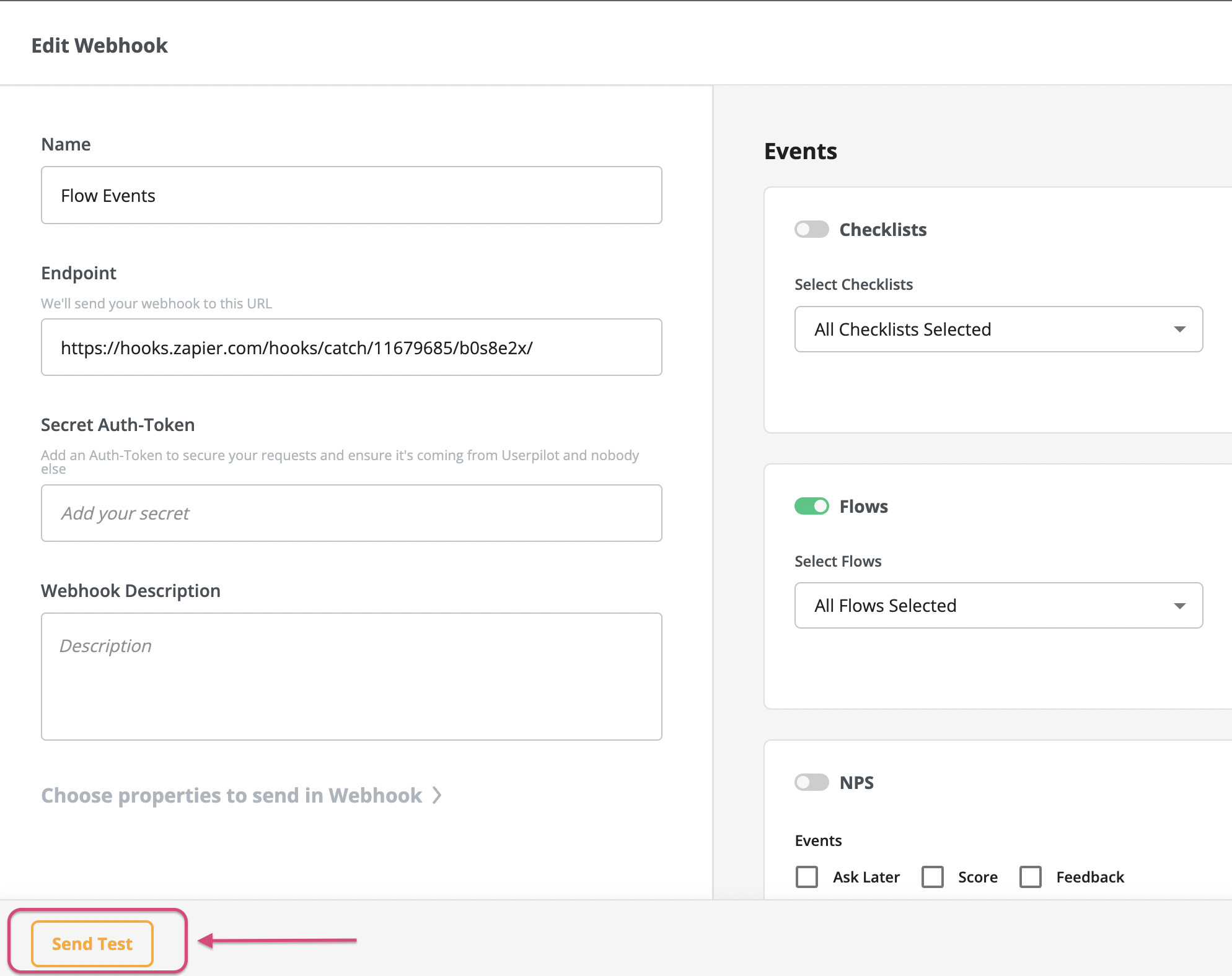 When activated, Userpilot will be sending real-time notifications to the defined end-point whenever certain events happen. These notifications will happen without any delay to allow you to make time-sensitive data-driven decisions.