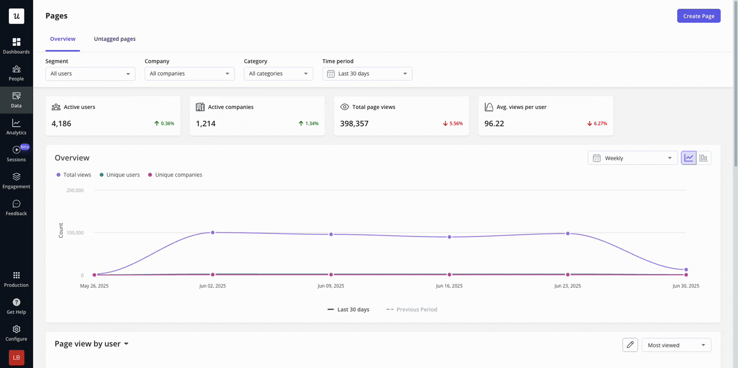 Clicking into a Tagged Page will provide useful insights into how the Page is performing, including:- User views: The number of unique users that have visited the page within the time frame specified.