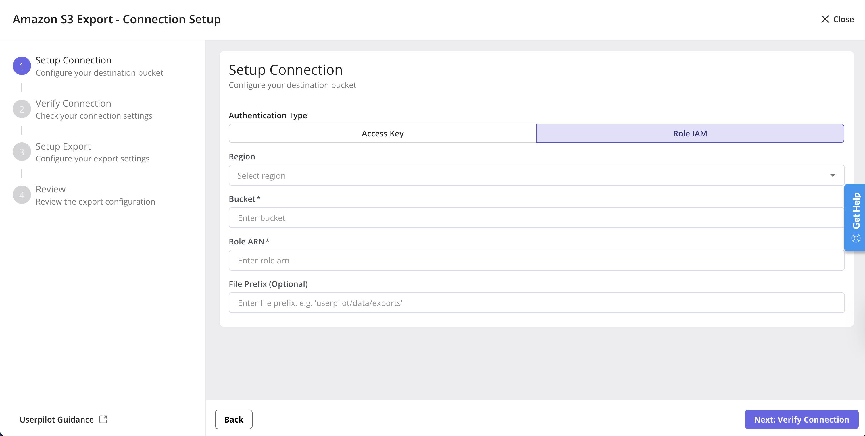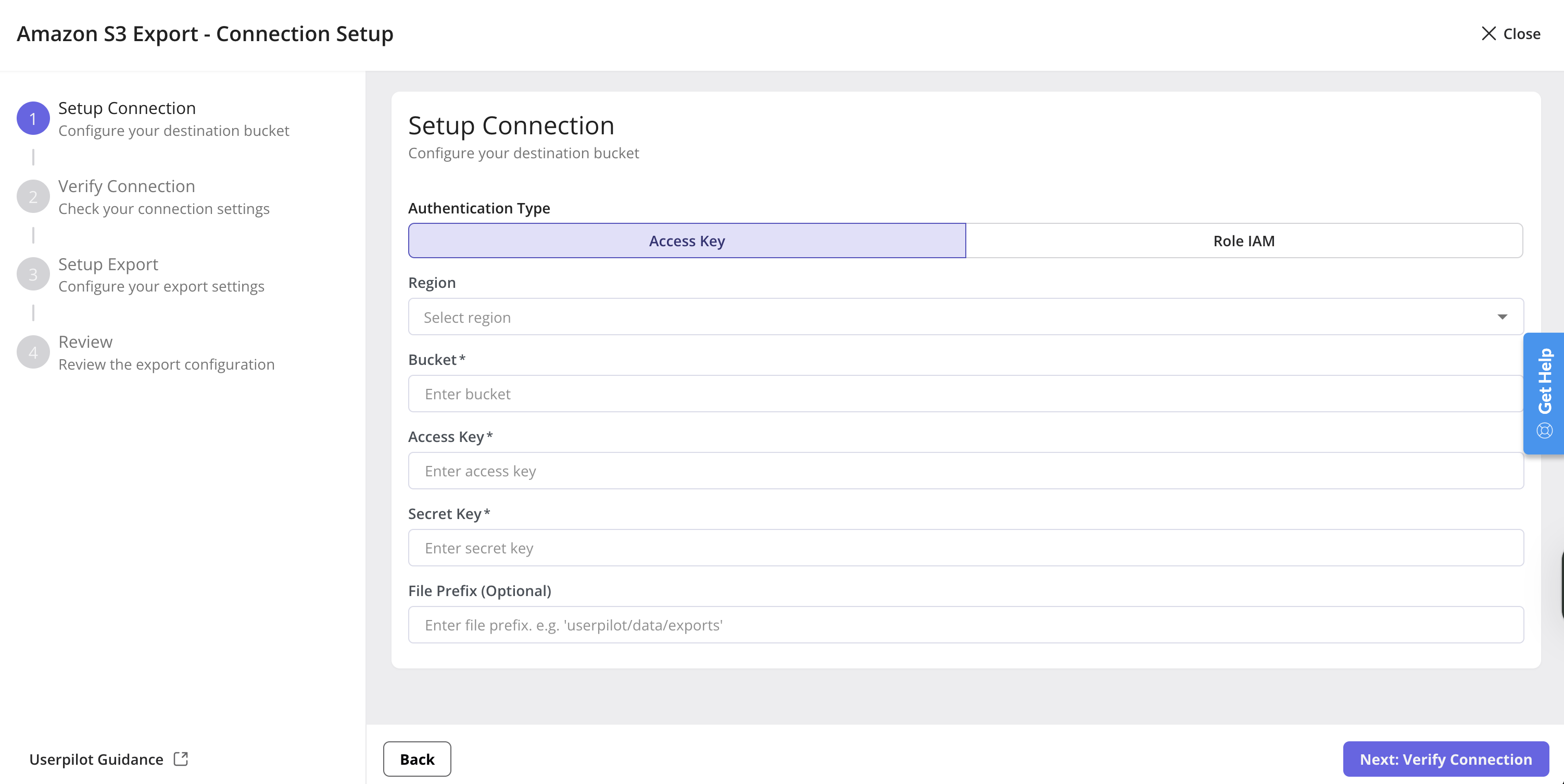 Once you provide your connection details, Userpilot will attempt to verify the connection to your cloud storage bucket. This is done by trying to upload a small test file to the bucket and then deleting it if successful.