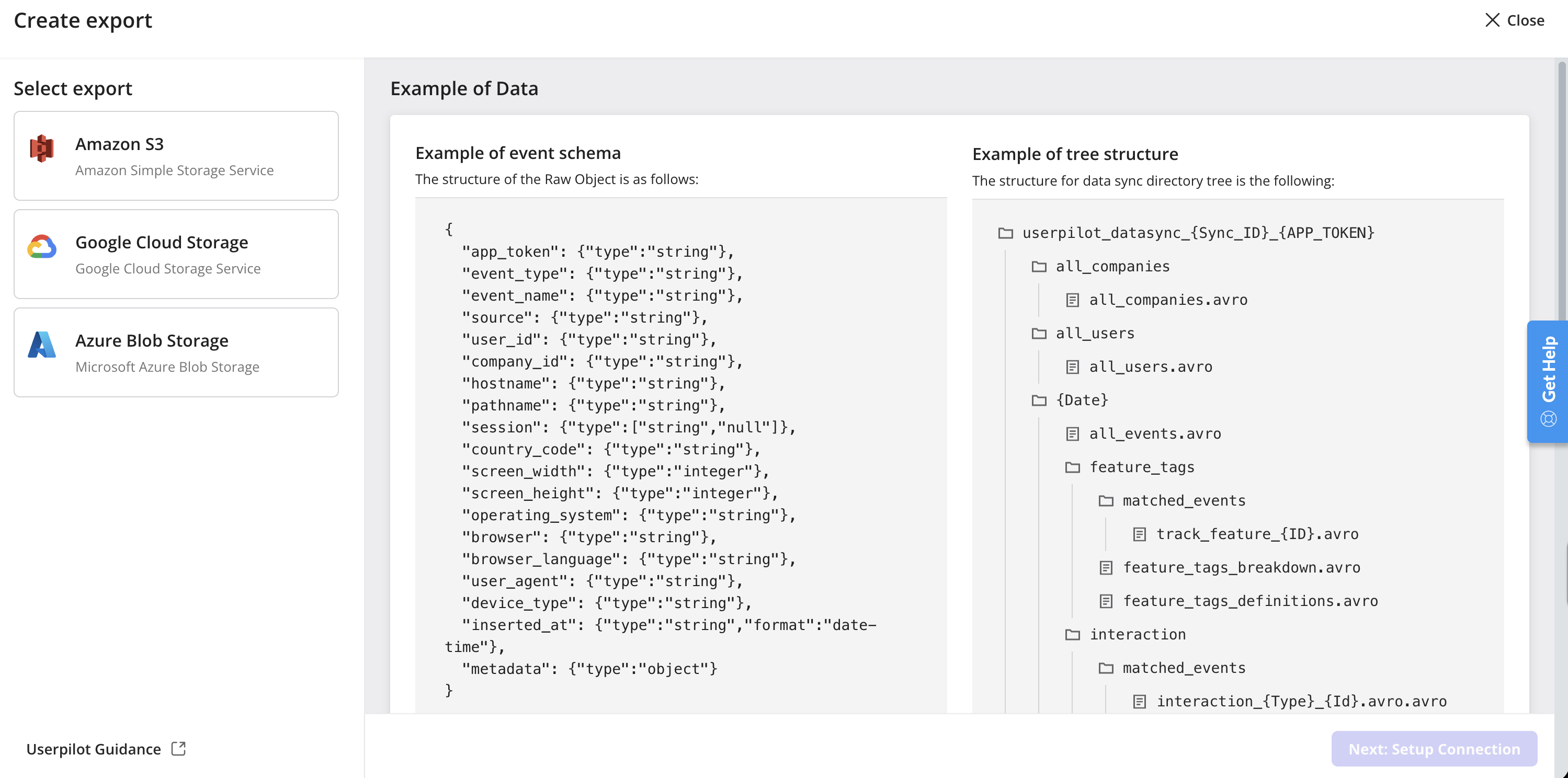 Setting up a new export job involves a straightforward wizard that guides you through the necessary configuration steps. Once you click the “Create Export” button on the Data Sync dashboard, the creation process begins. The wizard typically involves the following main stages, which we will detail using Google Cloud Storage as an example:- Select Export Destination & Review Data Structure