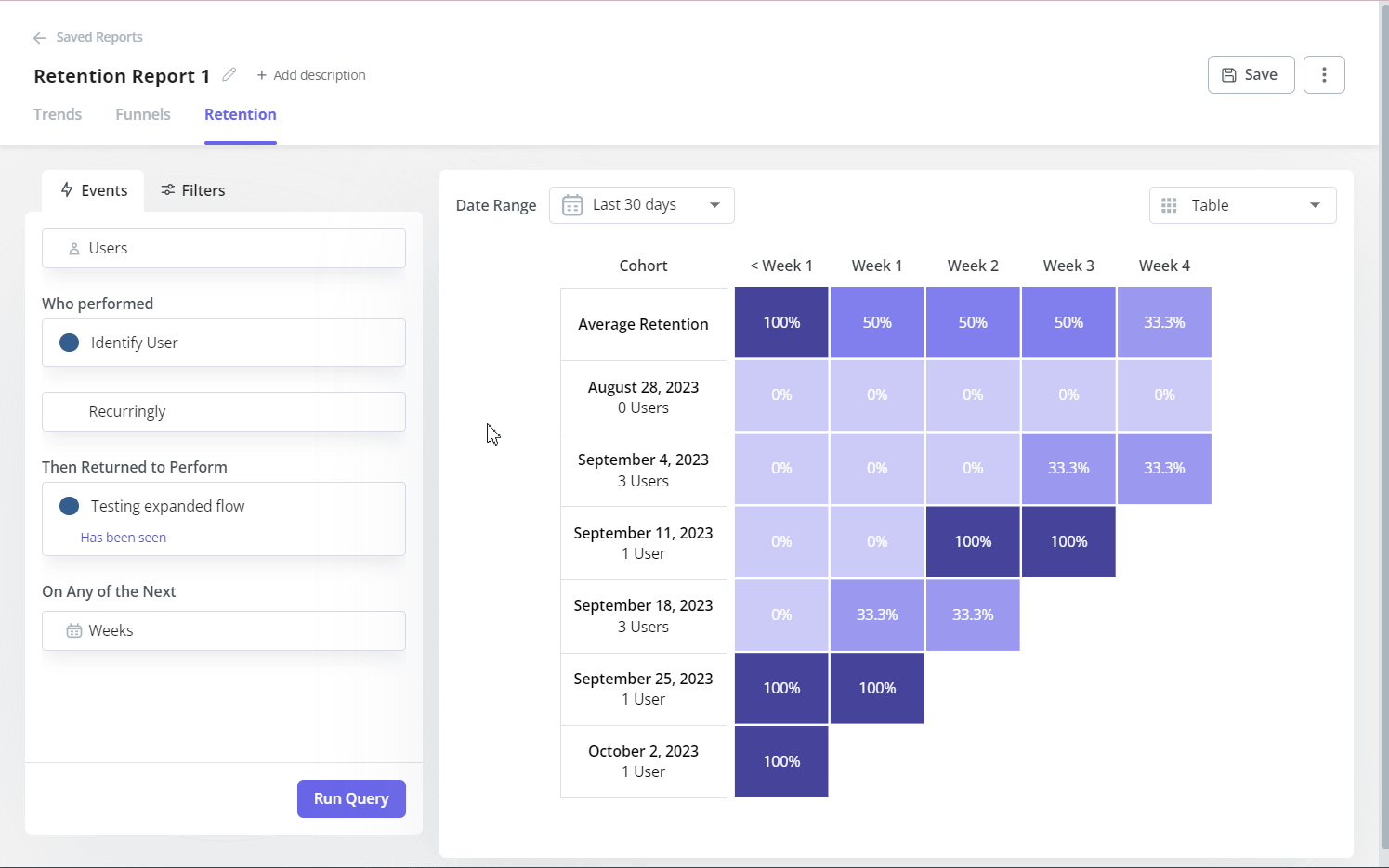 Once you click on “Run Query” you will be able to see your results on the right section of your screen. First, you can select the Date Range in which you want to measure your Retention Data. There are different two types of data visualization options, it is possible to view this retention data in a Cohort Table or as a Trend.Cohort Table