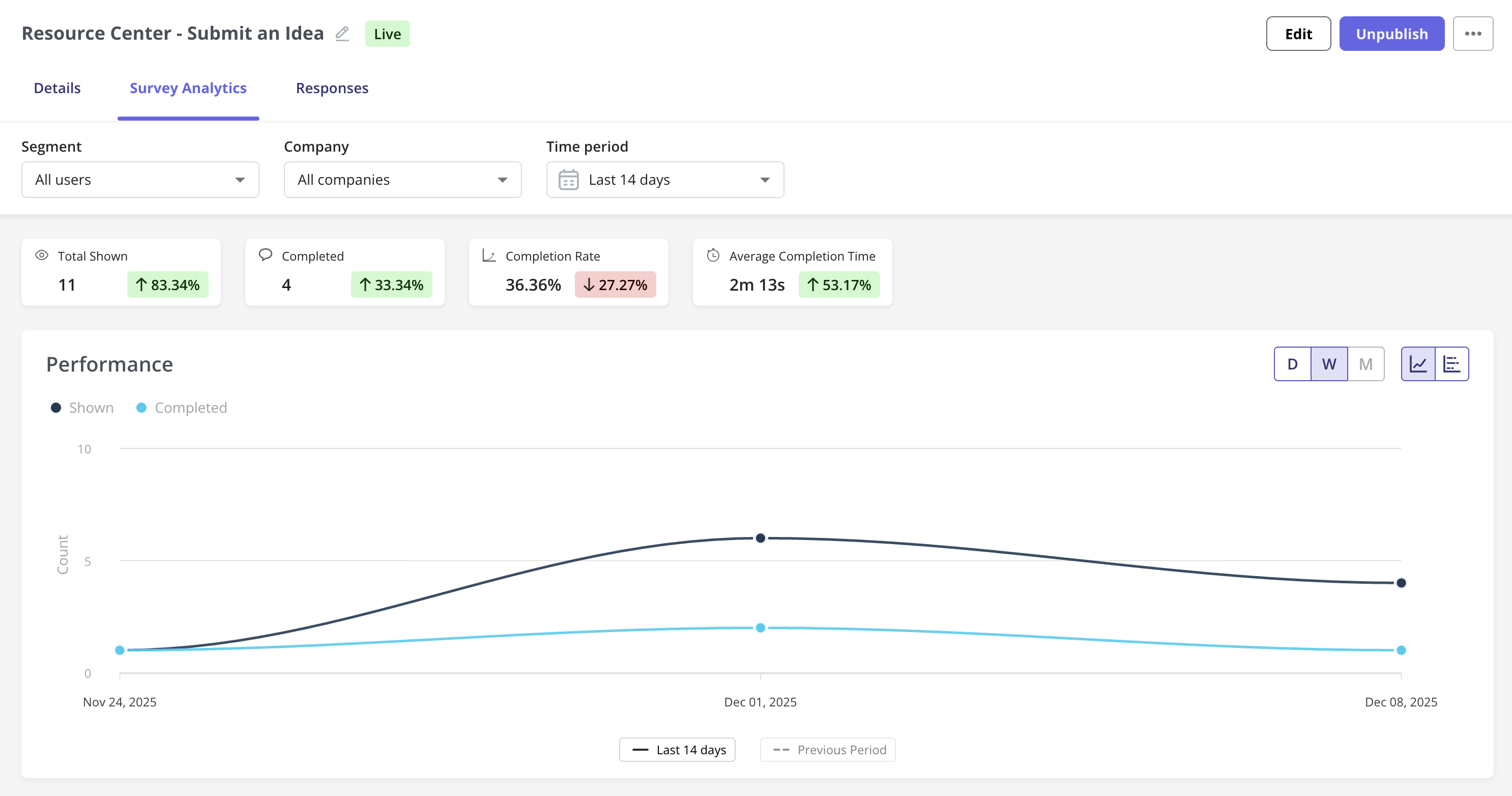 The Survey Analytics tab provides key performance insights with filtering options by segment, company, and time period. The main metrics include:- Total Shown: Number of users who have seen the survey.