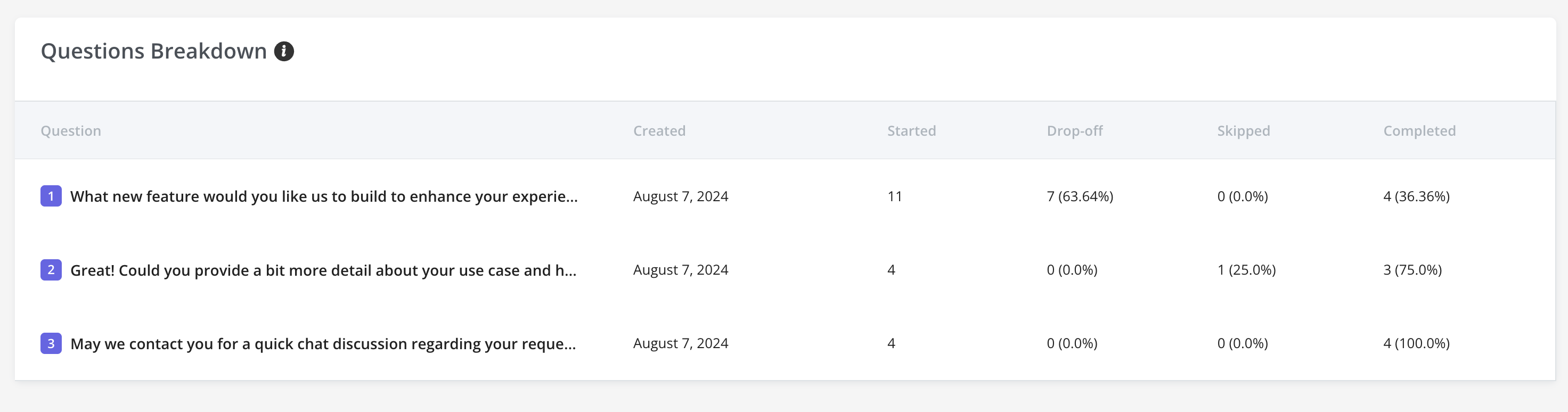 - Completed: Users who answered all questions or reached a logical survey endpoint.